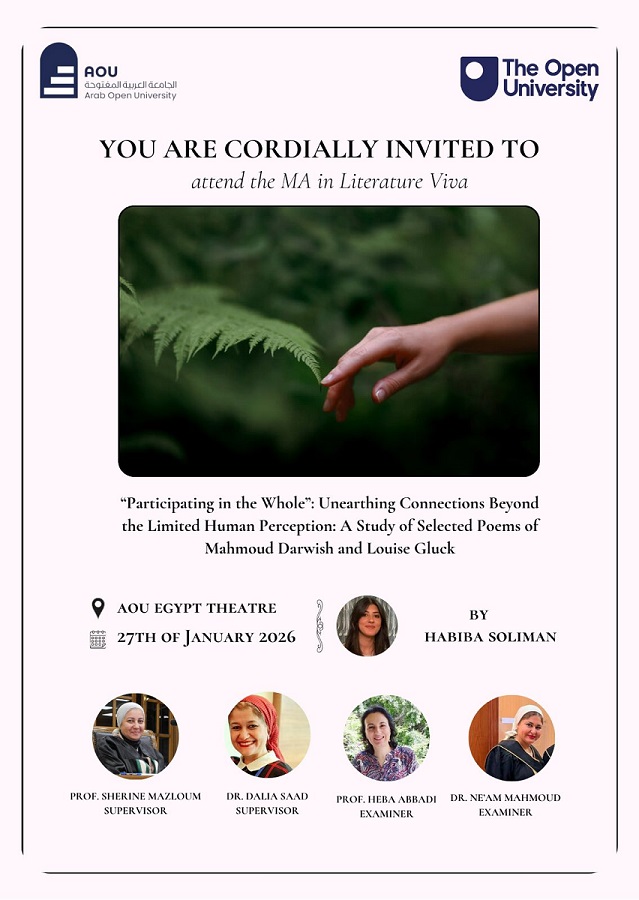You are cordially invited to attend Ms. Habiba Soliman's MA Viva on Tuesday, the 27th of January 2026, at 11:00 AM. Wish the candidate the best of luck